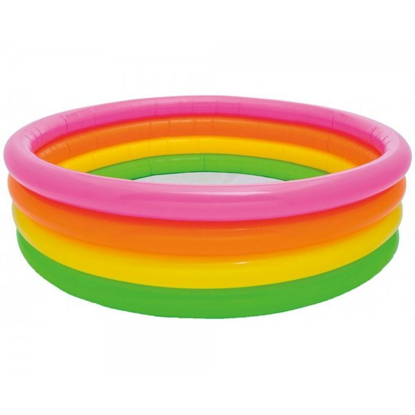 Надувные бассейны лёгкие, компактные и мобильные. Бассейн можно купить для дачи, а при необходимости — перевезти в другое место. А ещё они, как правило, яркой расцветки, что немаловажно для детей. Надувной бассейн INTEX Sunset Glow тоже ярких радужных цветов, поэтому, несомненно, придётся по душе вашим детям.