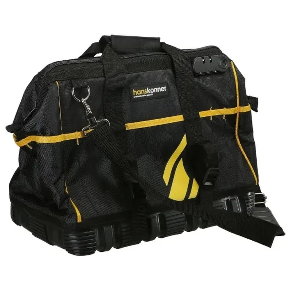 Сумка для инструментов Hanskonner 38 карманов HKTB0138 - оснащена кодовым замком для безопасного хранения инструмента внутри. 100% полиэстер выдерживает нагрузку в 30 кг, устойчив к растяжению и стиранию. Дополнительные вставки в стенки сумки позволяют ей лучше держать эргономичную форму при переноске инструментов. Быстрая широкая молния позволяет мгновенно открыть сумку и получить доступ к инструменту. Съёмная перегородка во внутреннем отделе сумки помогает зонировать пространство для инструмента, а также сама снабжена карманами. Возможность её снятия позволяет полностью контролировать эргономику хранения инструмента. Дно выполнено из пластика для защиты инструмента как от ударного внешнего воздействия, так и от возможного контакта с водой. Удобная скоба для хранения рулетки обеспечивает быстрый доступ к ней.