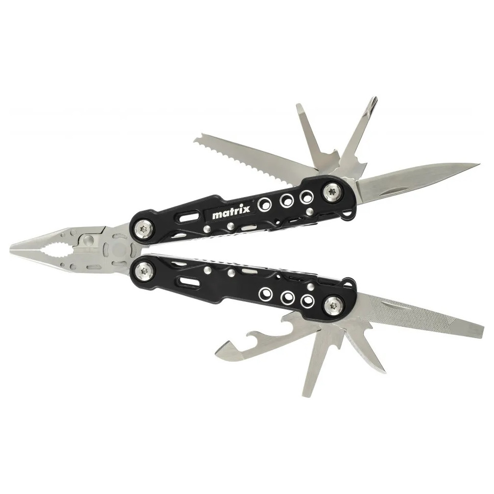 Трансформер MATRIX 13 функций 165мм 17622 -включает длинногубцы с кусачками и захватом полукруглых предметов, а также отвертки. Инструмент пригодится в походе, на рыбалке или охоте, поскольку имеет в составе нож, пилу, открывалку и консервный нож. Благодаря пилке для ногтей мультитул будет полезен в быту.