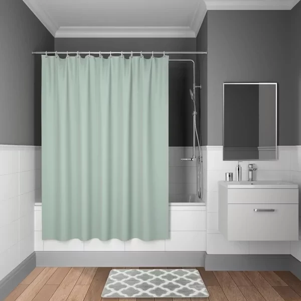 Однотонная текстильная штора для ванной пастельного зеленого цвета с приятной на ощупь фактурой, бархатистой, как кожа персика. Напоминает обычные шторы и соответствует актуальному тренду оформления ванной как уютной жилой комнаты.